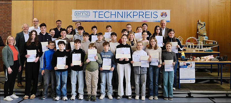 Wolfgang Schrüfer, Susanne Wagner sowie Andreas Plach und Manfredi Signorino von der Firma emz durften anschließend die vielen Gewinnerinnen und Gewinner des diesjährigen Technikwettbewerbs auszeichnen: