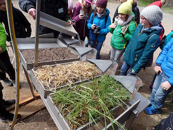 Was sich in der Erde befindet, lernten wir bei der zweiten Station kennen, nämlich Wurzeln, Gras, kleine Steine und Humus. In der Erde sind außerdem Nährstoffe, die die Pflanzen mit ihren Wurzeln aus dem Boden ziehen.