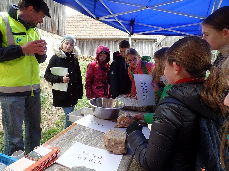 Bei dem zweiten Teil der Station durften Schüler eine Bodenprobe mit einem bestimmten Stab entnehmen. Dabei lernten wir, dass der Boden verschiedene Schichten hat, die dunkler oder heller sind. Danach durften wir verschiedenen Steinen die richtigen Namen zuordnen und anschließend gab es noch ein Quiz darüber.
